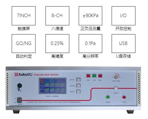 ATC系列八通道氣密儀采用差壓檢測原理,是一款高精度的檢測儀器,廣泛應用于多種產品的密封性檢測。儀器采用7英寸觸摸屏顯示,智能化的操作界面,測試程式可靈活編輯并存儲,測試數據實時記錄保存到U盤, ATC6000系列多通道氣密儀可以滿足實驗室的產品泄漏分析,也可以在生產線對產品氣密性進行快速檢測,ATC6000系列多通道氣密儀的I/O端口可以配合自動化生產線完成在線式測量。